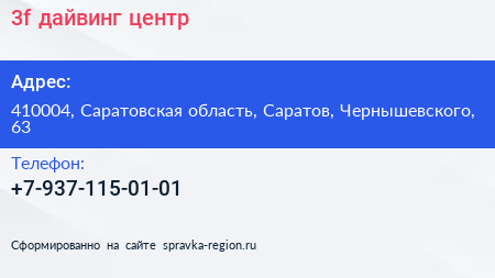 3f, дайвинг-центр по адресу 410004, Саратовская область, Саратов, Чернышевского, 63 в дальнейшем Организация, размещена в следующих категориях: