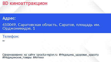 8D, киноаттракцион по адресу 410049, Саратовская область, Саратов, площадь им. Орджоникидзе, 1 в дальнейшем Организация, размещена в следующих категориях: