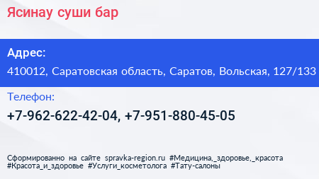 Ясинау, суши-бар по адресу 410012, Саратовская область, Саратов, Вольская, 127/133 в дальнейшем Организация, размещена в следующих категориях: