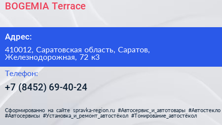 BOGEMIA Terrace по адресу 410012, Саратовская область, Саратов, Железнодорожная, 72 к3 в дальнейшем Организация, размещена в следующих категориях: