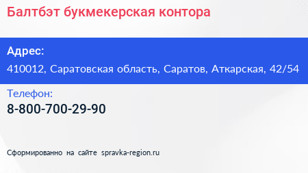 Балтбэт, букмекерская контора по адресу 410012, Саратовская область, Саратов, Аткарская, 42/54 в дальнейшем Организация, размещена в следующих категориях: