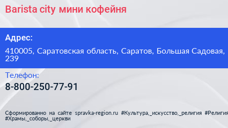 Barista city, мини-кофейня по адресу 410005, Саратовская область, Саратов, Большая Садовая, 239 в дальнейшем Организация, размещена в следующих категориях: