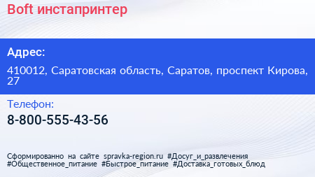 Boft, инстапринтер по адресу 410012, Саратовская область, Саратов, проспект Кирова, 27 в дальнейшем Организация, размещена в следующих категориях: