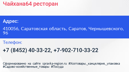 Чайхана64, ресторан по адресу 410056, Саратовская область, Саратов, Чернышевского, 96 в дальнейшем Организация, размещена в следующих категориях: