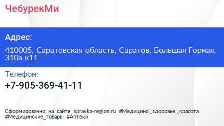 ЧебурекМи по адресу 410005, Саратовская область, Саратов, Большая Горная, 310а к11 в дальнейшем Организация, размещена в следующих категориях: