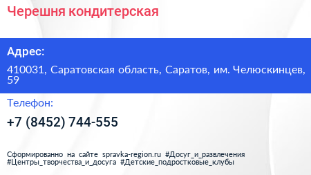 Черешня, кондитерская по адресу 410031, Саратовская область, Саратов, им. Челюскинцев, 59 в дальнейшем Организация, размещена в следующих категориях: