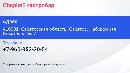 ChaplinS, гастробар по адресу 410031, Саратовская область, Саратов, Набережная Космонавтов, 7 в дальнейшем Организация, размещена в следующих категориях: