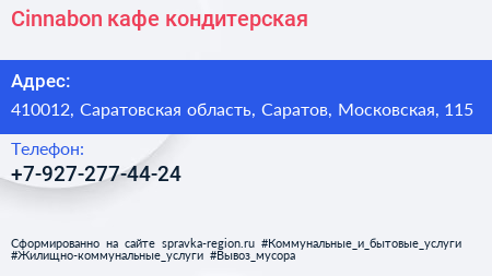 Cinnabon, кафе-кондитерская по адресу 410012, Саратовская область, Саратов, Московская, 115 в дальнейшем Организация, размещена в следующих категориях: