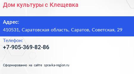 Дом культуры, с. Клещевка по адресу 410531, Саратовская область, Саратов, Советская, 29 в дальнейшем Организация, размещена в следующих категориях: