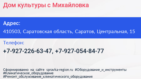 Дом культуры, с. Михайловка по адресу 410503, Саратовская область, Саратов, Центральная, 15 в дальнейшем Организация, размещена в следующих категориях: