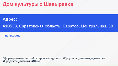 Дом культуры, с. Шевыревка по адресу 410533, Саратовская область, Саратов, Центральная, 58 в дальнейшем Организация, размещена в следующих категориях: