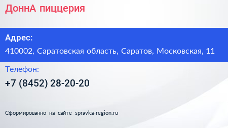 ДоннА, пиццерия по адресу 410002, Саратовская область, Саратов, Московская, 11 в дальнейшем Организация, размещена в следующих категориях: