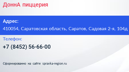 ДоннА, пиццерия по адресу 410054, Саратовская область, Саратов, Садовая 2-я, 104д в дальнейшем Организация, размещена в следующих категориях: