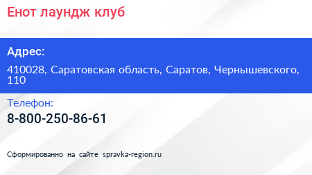 Енот, лаундж-клуб по адресу 410028, Саратовская область, Саратов, Чернышевского, 110 в дальнейшем Организация, размещена в следующих категориях: