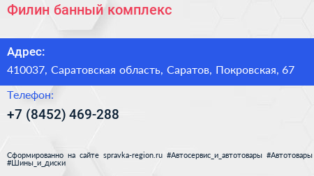 Филин, банный комплекс по адресу 410037, Саратовская область, Саратов, Покровская, 67 в дальнейшем Организация, размещена в следующих категориях: