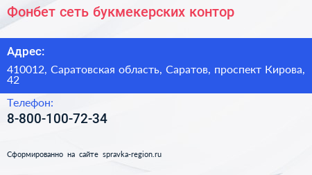 Фонбет, сеть букмекерских контор по адресу 410012, Саратовская область, Саратов, проспект Кирова, 42 в дальнейшем Организация, размещена в следующих категориях: