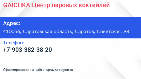 GAICHKA, Центр паровых коктейлей по адресу 410056, Саратовская область, Саратов, Советская, 98 в дальнейшем Организация, размещена в следующих категориях:
