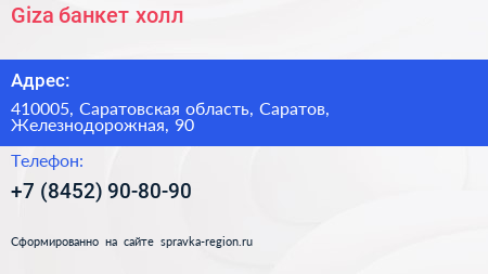 Giza, банкет-холл по адресу 410005, Саратовская область, Саратов, Железнодорожная, 90 в дальнейшем Организация, размещена в следующих категориях: