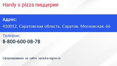 Hardy`s pizza, пиццерия по адресу 410012, Саратовская область, Саратов, Московская, 66 в дальнейшем Организация, размещена в следующих категориях: