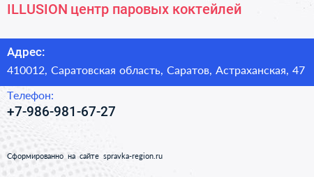 ILLUSION, центр паровых коктейлей по адресу 410012, Саратовская область, Саратов, Астраханская, 47 в дальнейшем Организация, размещена в следующих категориях: