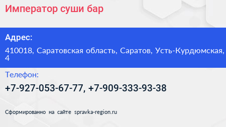 Император, суши-бар по адресу 410018, Саратовская область, Саратов, Усть-Курдюмская, 4 в дальнейшем Организация, размещена в следующих категориях: