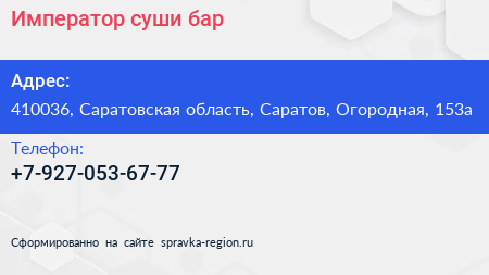 Император, суши-бар по адресу 410036, Саратовская область, Саратов, Огородная, 153а в дальнейшем Организация, размещена в следующих категориях: