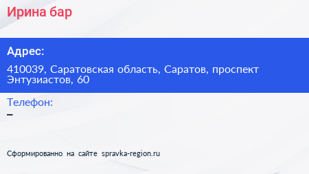 Ирина, бар по адресу 410039, Саратовская область, Саратов, проспект Энтузиастов, 60 в дальнейшем Организация, размещена в следующих категориях: