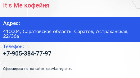 It`s Me, кофейня по адресу 410004, Саратовская область, Саратов, Астраханская, 22/36а в дальнейшем Организация, размещена в следующих категориях: