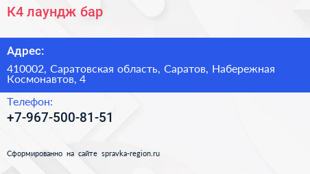 К4, лаундж-бар по адресу 410002, Саратовская область, Саратов, Набережная Космонавтов, 4 в дальнейшем Организация, размещена в следующих категориях: