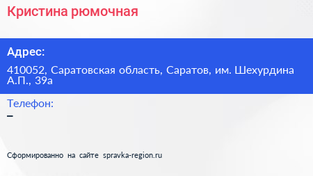 Кристина, рюмочная по адресу 410052, Саратовская область, Саратов, им. Шехурдина А.П., 39а в дальнейшем Организация, размещена в следующих категориях: