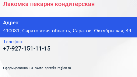 Лакомка, пекарня-кондитерская по адресу 410031, Саратовская область, Саратов, Октябрьская, 44 в дальнейшем Организация, размещена в следующих категориях: