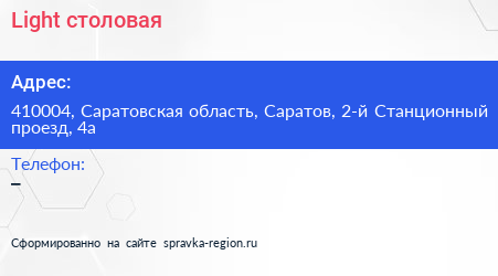 Light, столовая по адресу 410004, Саратовская область, Саратов, 2-й Станционный проезд, 4а в дальнейшем Организация, размещена в следующих категориях: