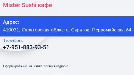 Mister Sushi, кафе по адресу 410031, Саратовская область, Саратов, Первомайская, 64 в дальнейшем Организация, размещена в следующих категориях: