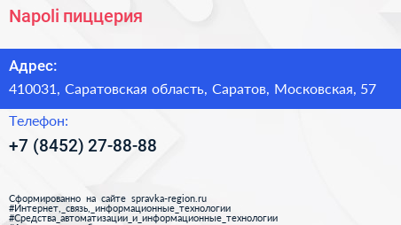 Napoli, пиццерия по адресу 410031, Саратовская область, Саратов, Московская, 57 в дальнейшем Организация, размещена в следующих категориях: