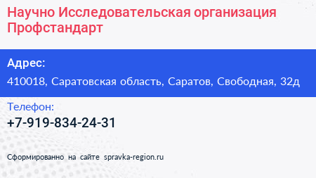 Научно-Исследовательская организация Профстандарт по адресу 410018, Саратовская область, Саратов, Свободная, 32д в дальнейшем Организация, размещена в следующих категориях: