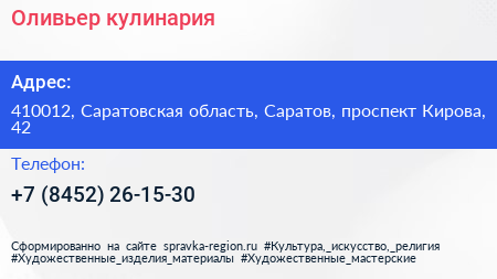 Оливьер, кулинария по адресу 410012, Саратовская область, Саратов, проспект Кирова, 42 в дальнейшем Организация, размещена в следующих категориях: