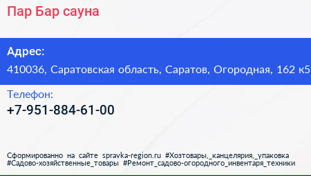Пар-Бар, сауна по адресу 410036, Саратовская область, Саратов, Огородная, 162 к5 в дальнейшем Организация, размещена в следующих категориях: