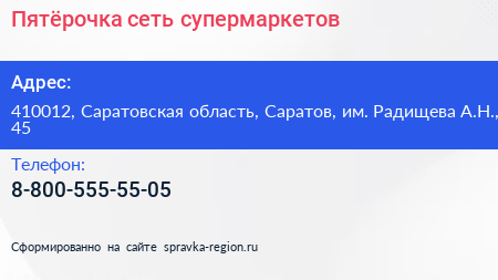 Пятёрочка, сеть супермаркетов по адресу 410012, Саратовская область, Саратов, им. Радищева А.Н., 45 в дальнейшем Организация, размещена в следующих категориях: