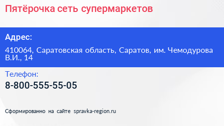 Пятёрочка, сеть супермаркетов по адресу 410064, Саратовская область, Саратов, им. Чемодурова В.И., 14 в дальнейшем Организация, размещена в следующих категориях: