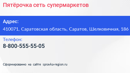 Пятёрочка, сеть супермаркетов по адресу 410071, Саратовская область, Саратов, Шелковичная, 186 в дальнейшем Организация, размещена в следующих категориях: