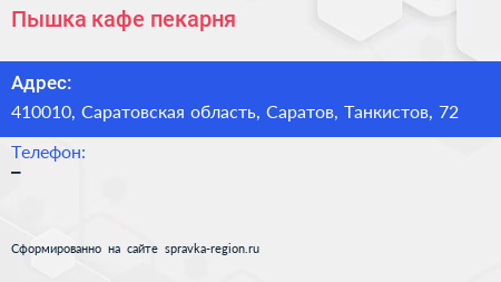 Пышка, кафе-пекарня по адресу 410010, Саратовская область, Саратов, Танкистов, 72 в дальнейшем Организация, размещена в следующих категориях: