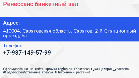 Ренессанс, банкетный зал по адресу 410004, Саратовская область, Саратов, 2-й Станционный проезд, 6а в дальнейшем Организация, размещена в следующих категориях: