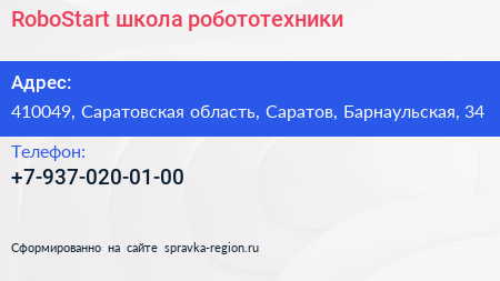 RoboStart, школа робототехники по адресу 410049, Саратовская область, Саратов, Барнаульская, 34 в дальнейшем Организация, размещена в следующих категориях: