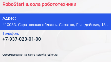 RoboStart, школа робототехники по адресу 410033, Саратовская область, Саратов, Гвардейская, 13в в дальнейшем Организация, размещена в следующих категориях:
