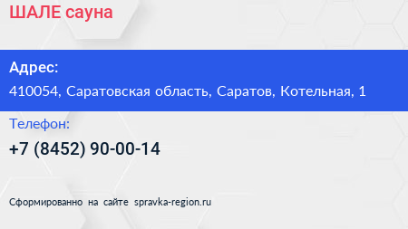 ШАЛЕ, сауна по адресу 410054, Саратовская область, Саратов, Котельная, 1 в дальнейшем Организация, размещена в следующих категориях: