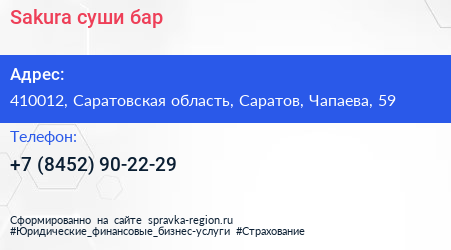Sakura, суши-бар по адресу 410012, Саратовская область, Саратов, Чапаева, 59 в дальнейшем Организация, размещена в следующих категориях: