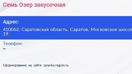 Семь Озер, закусочная по адресу 410062, Саратовская область, Саратов, Московское шоссе, 19 в дальнейшем Организация, размещена в следующих категориях: