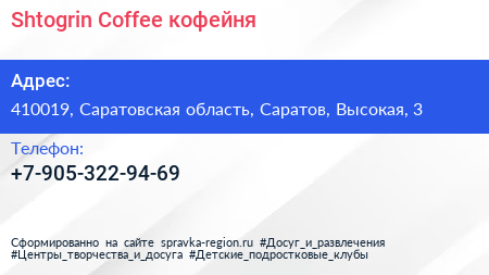Shtogrin Coffee, кофейня по адресу 410019, Саратовская область, Саратов, Высокая, 3 в дальнейшем Организация, размещена в следующих категориях: