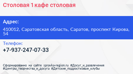Столовая №1, кафе-столовая по адресу 410012, Саратовская область, Саратов, проспект Кирова, 54 в дальнейшем Организация, размещена в следующих категориях: