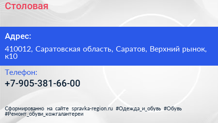 Столовая по адресу 410012, Саратовская область, Саратов, Верхний рынок, к10 в дальнейшем Организация, размещена в следующих категориях: